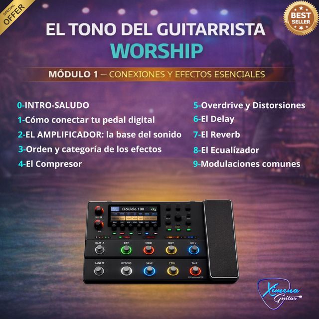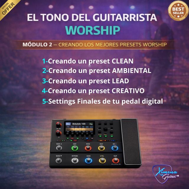 Finalmente aplicarás todo este conocimiento creando presets esenciales para la música worship: clean, ambiental, lead y sonidos creativos que podrás adaptar fácilmente a cualquier pedal digital.